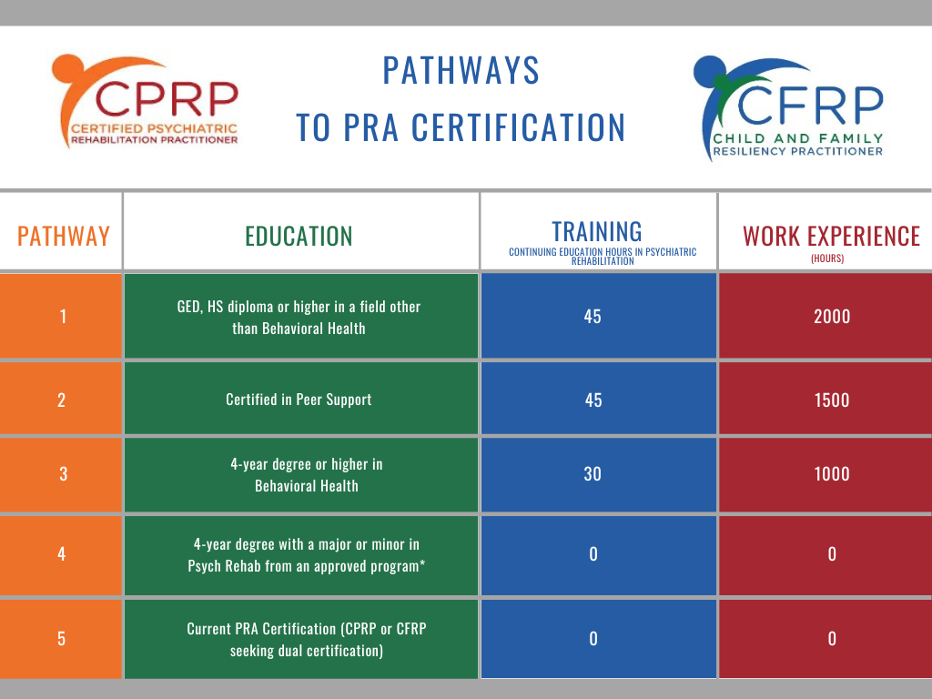 A PRA credential verifies that you have met rigorous standards demonstrating your competence and dedication to the field and to the promise of recovery! For those primarily serving Adults and/or Transition Age Youth (over age 16), PRA offers the Certified Psychiatric Rehabilitation Practitioner (CPRP) credential. For those primarily serving Children and Youth (under age 18), PRA offers the Child and Family Resiliency Practitioner (CFRP) credential. Current CPRPs and CFRPs vary from MDs, PhDs to GEDs, occupational therapists to peer specialists, social workers to caseworkers – all sharing a commitment to the fundamental principle that recovery from serious mental illness is possible.