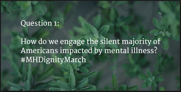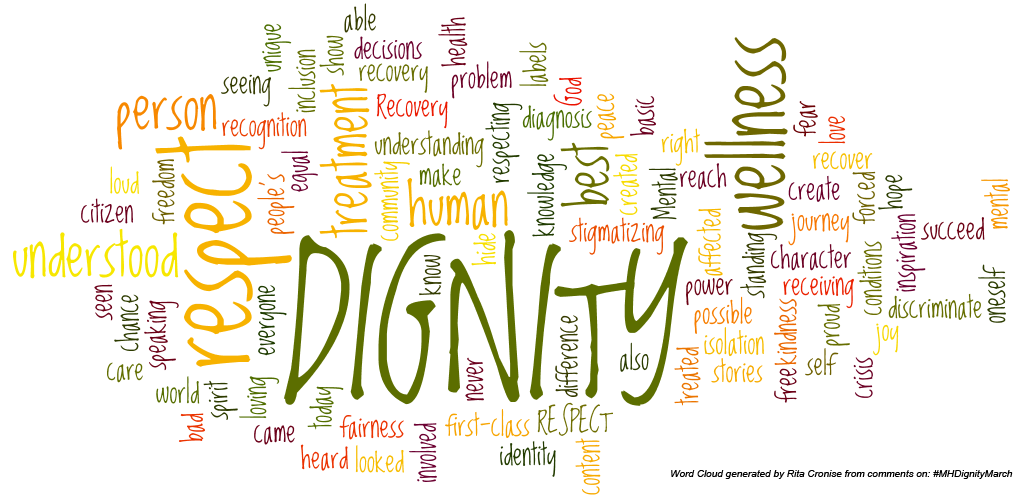 Among the comments of others on the #MHDignityMarch twitter feed were: “Dignity means speaking loud and standing proud”; “Dignity means: We’re bad! We know it! We came today to show it!” And from many others: “Dignity means power…respect…inclusion…being heard and understood!... equal treatment…no stigmatizing, no labels, and no forced treatment…being looked at as a first-class citizen…loving myself…receiving care BEFORE you reach a crisis…being more than my diagnosis.” Finally, “Dignity means we can create a world where everyone affected by mental health conditions has the best chance possible to succeed and recover free from fear and isolation.”